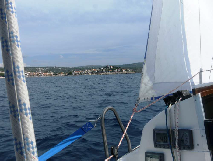 Im Kanal wieder eher ruhiges Wetter. Nachdem wir die Festung Sv.Nikola passiert haben, setzen wir die Segel und heben den Motor an. Der Wind hat sich mit 4 Bft recht gut entwickelt. Da sich aber immer mehr Wolken landwärts auftürmen, binden wir ein Reff ins Groß.